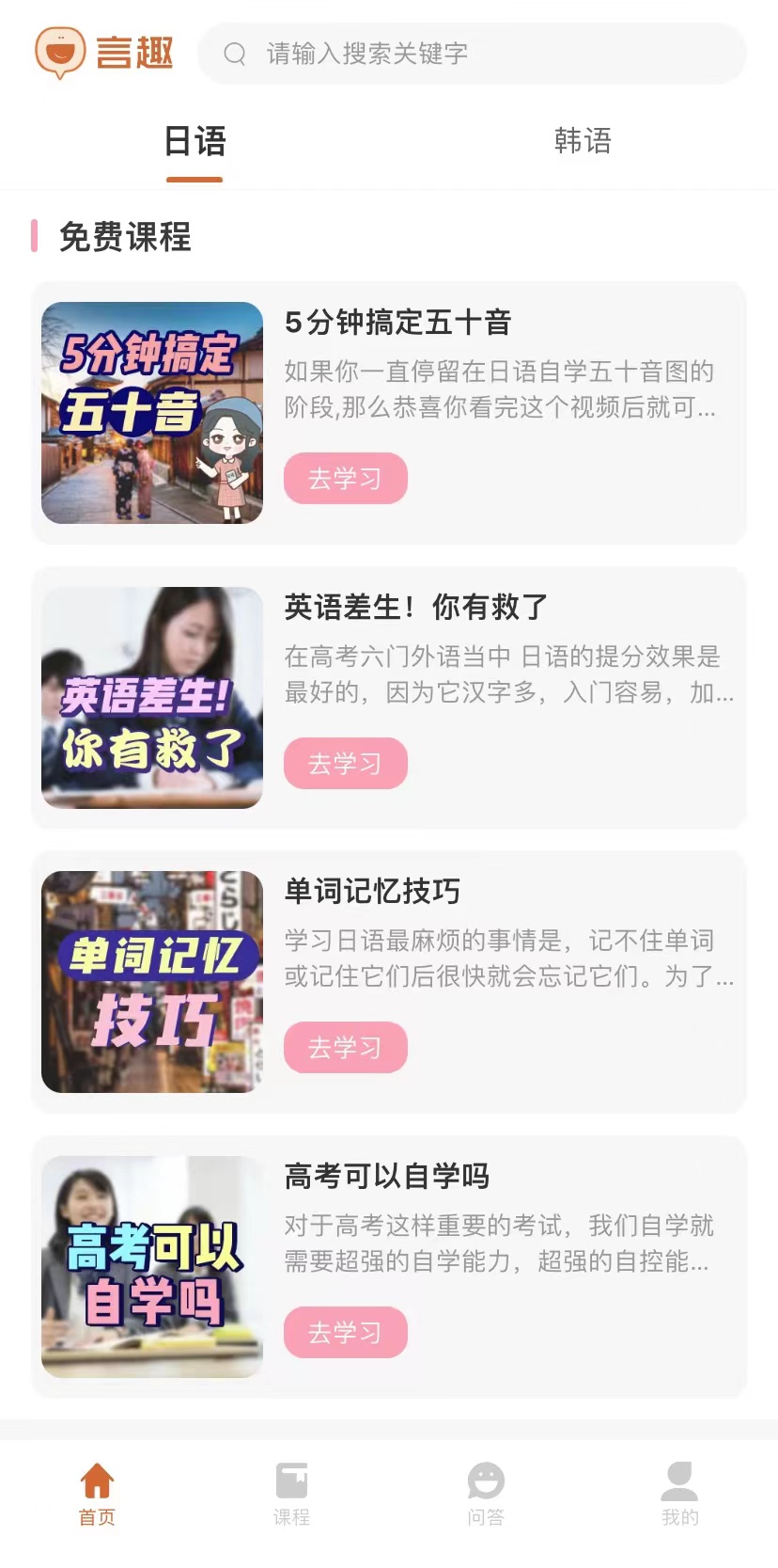“言趣教育”是一款专为小语种爱好者打造的语言学习软件,应用包含日语、韩语、德语、法语、俄语、西班牙语等科目,可实现多门语言的在线听课、学习、练习、测试、翻译等功能,致力于打造小语种的线上“沉浸式”学习体验。
